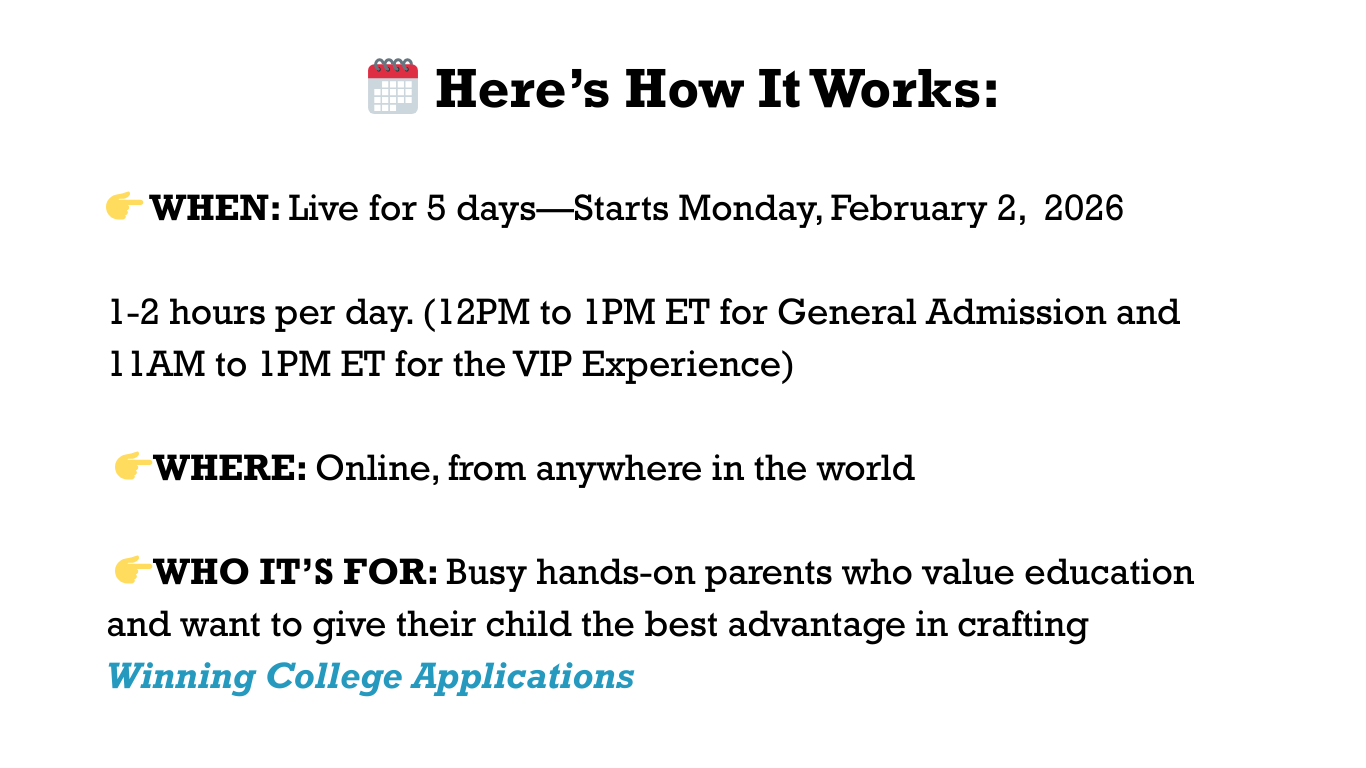 In just five days, I’m going to teach you—live—how to help your child craft applications that stand out, resonate, and win.